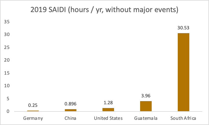 I've discussed this expectation of reliability with a friend of mine who lives in South Africa about their electric system; they constantly have "brownouts" and even blackouts!12 It is not a rare occurrence to lose power. During these brownouts, diesel-based generators come online behind the meter for customers who have them; the ability to use power is dependent on the customer’s financial resources to install and operate their own generator. Rather than creating higher grid costs for all customers, the system allows the customer to take on themselves the cost associated with higher uptime of power.13